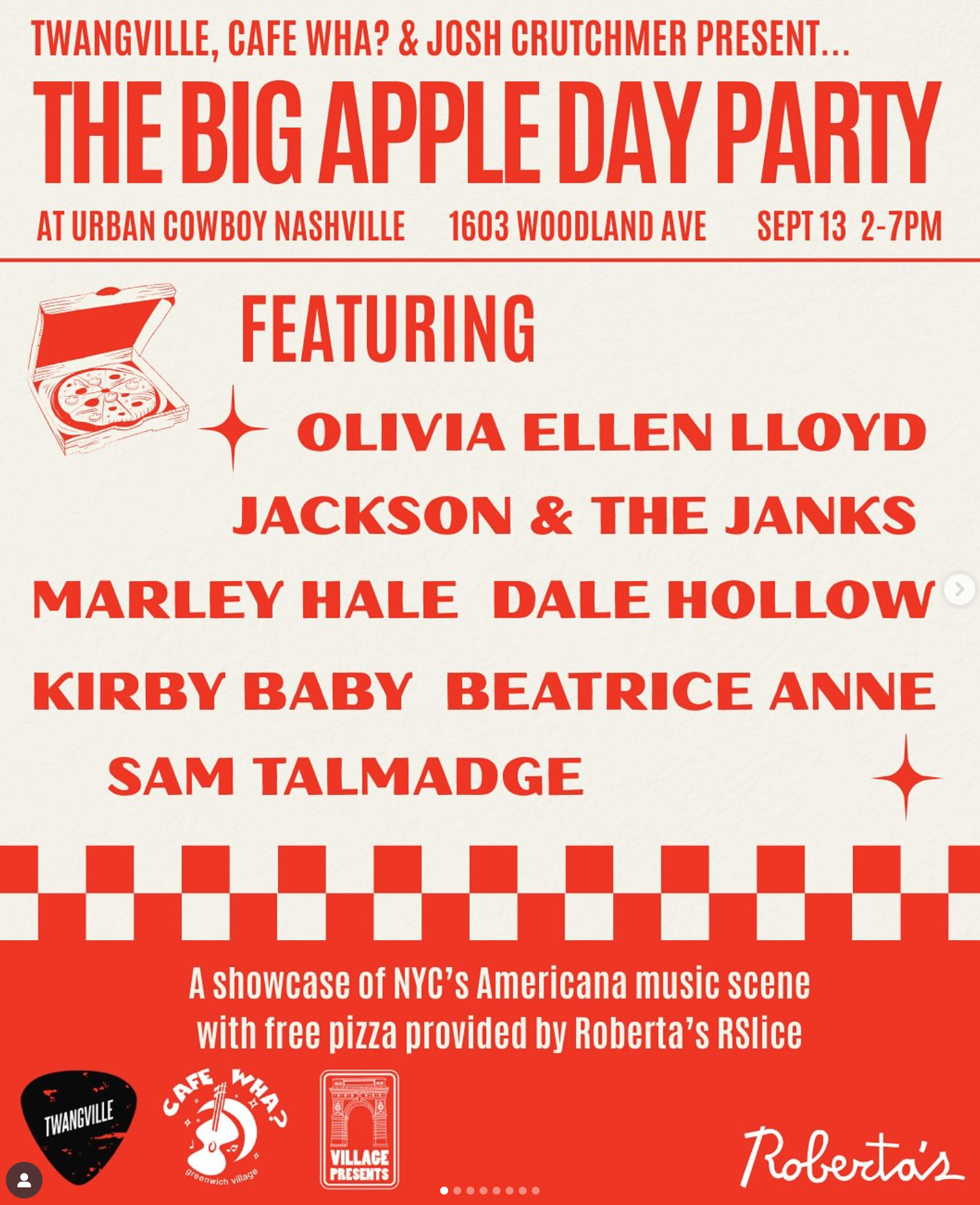 Friend of the newsletter Josh Crutchmer, along with Cafe Wha and Twangville, have put together a great day party at Urban Cowboy, celebrating NYC - catch Olivia Ellen Lloyd, Kirby Baby and others from 2 - 7 pm, plus free (actually good!) pizza. Then hit the Teamwass party at Skinny Dennis, for Elizabeth Cook, Mon Rovîa and the War + Treaty from 1 - 5 pm. The Commonwealth of Kentucky party at the Basement, from noon to 5 pm, will also be great.