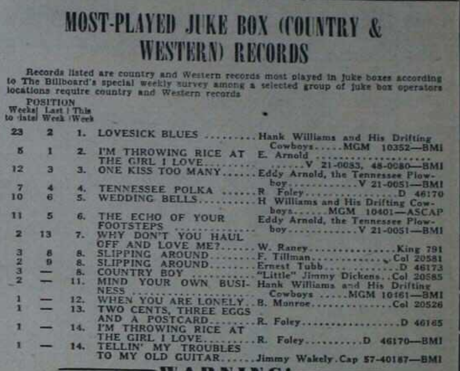 In a lot of ways, this looks like a current country chart — a whole lot of familiar white guys. Not that I’m trying to argue with Hank: “Lovesick Blues” was his first No. 1 song, and wound up spending 42 weeks (!) on the “Most Played Jukebox (Country & Western) Records” chart. A classic, obviously, and one whose place in country history belies its origins. “Lovesick Blues” was written not by Williams himself, or even those songwriters who were in the process of creating Music Row as we know it, but more than 25 years before this recording by Irving Mills and Cliff Friend — two denizens of the original hit factory, Tin Pan Alley. Granted, it’s almost unrecognizable in its original vaudevillian form — consider this version, recorded by Irving Kaufman (a Russian Jewish immigrant) under the name Jack Shea (lol). It was countrified in the intervening years, first by a minstrel singer named Emmett Miller in 1925 and then, more dramatically, by Rex Griffin in 1939. Of course Hank’s take is definitive, but! It was also the product of the zeitgeist :)