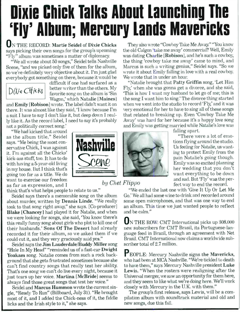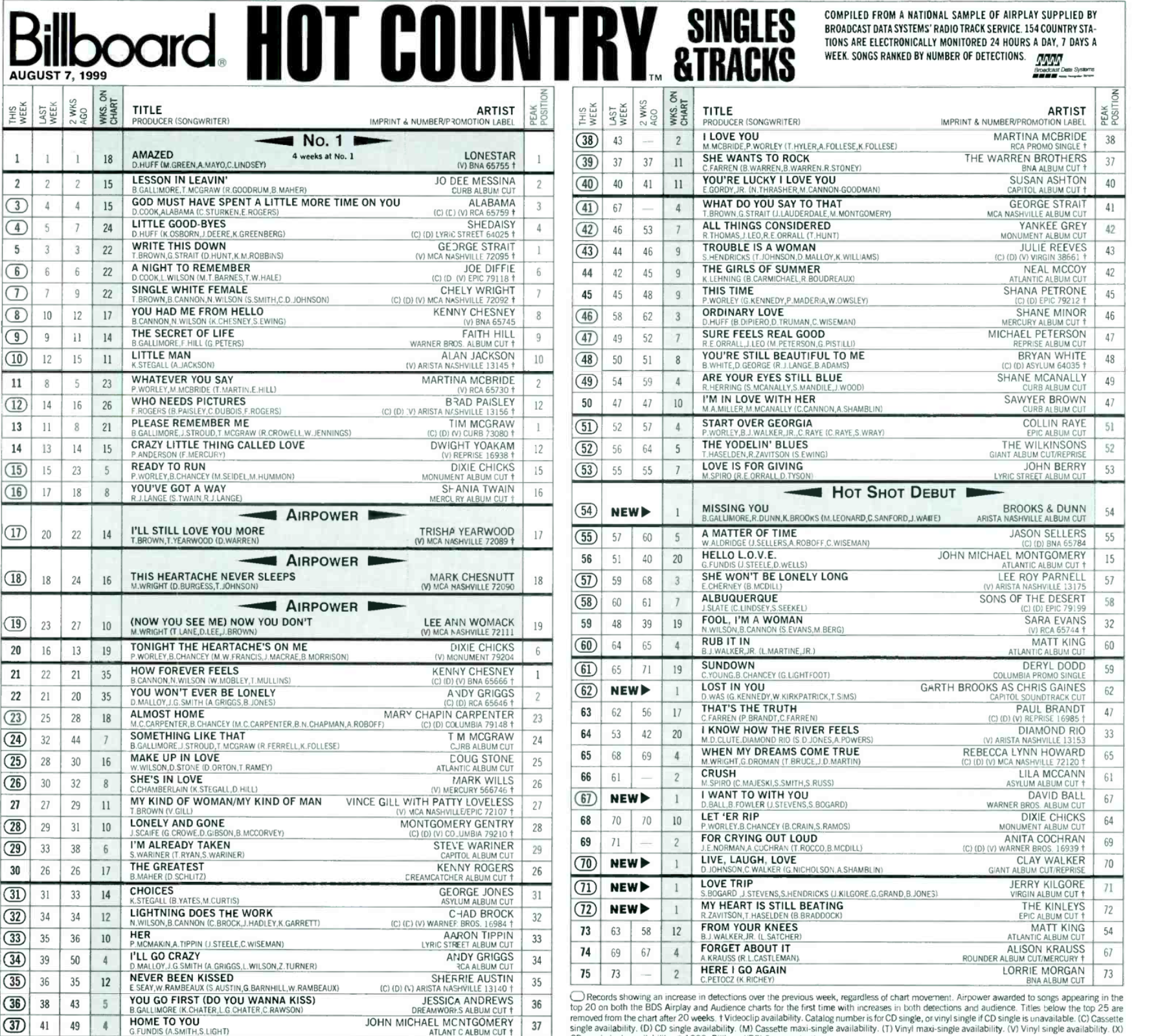 This chart is from just a few weeks before the release of Fly (do we need to do an anniversary piece…almost certainly). For context, Wide Open Spaces was still at No. 2 on the country albums chart — in its 78th week (the album was certified diamond by the RIAA in 2003). This was ostensibly the calm before the storm, and there are still three Chicks songs on this chart. “Tonight The Heartache’s On Me” and “Let ‘Er Rip” are both from Wide Open Spaces; “Let ‘Er Rip” wasn’t even released as a single. The people just love to hear Lloyd Maines shred that much!! “Ready To Run,” the lead single from Fly, had received its Runaway Bride bump (released July 30, 1999) and was climbing.