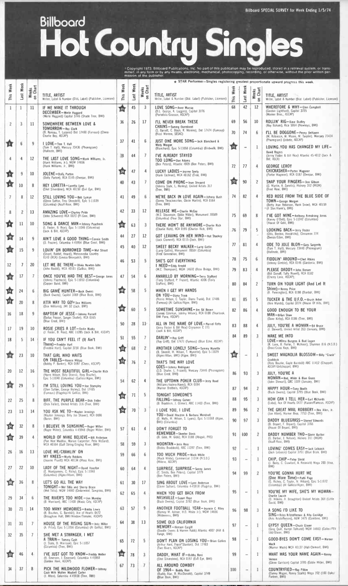 Anyway! Onto the charts. On top we have Merle Haggard’s “If We Make It Through December” — timeless, perfect, a song so good they had to give it its own non-Christmas album. You already know it I’m sure, so I won’t dwell. Loretta and Dolly are in the top 10 as they should be, along with Tom T. Hall and Charley Pride. I love little baby ducks and old pickup trucks, too.