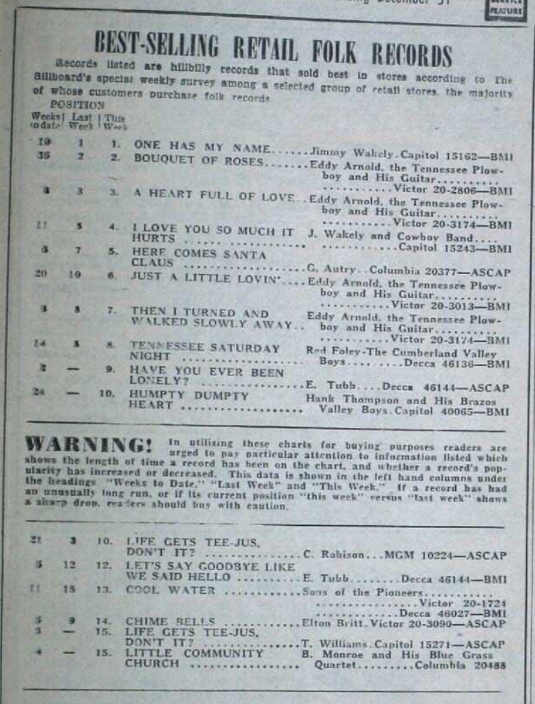 The Mills Brothers eventually appeared on the Hot Country Songs chart in 1970 with Charlie Louvin’s “It Ain’t No Big Thing.” See? Rabbit holes! This is the fun, and the danger. Also important: Yes, Gene Autry’s “Here Comes Santa Claus” was actually a new release. “Tennessee Saturday Night” is so close to being great, but it’s got an irredeemably racist refrain. There’s another classic on this one, the Sons of Pioneers’ “Cool Water” — which took three recordings and three movie appearances to finally stick. The first version was recorded for Decca in 1941, and the second and third — a pop version with Vaughn Monroe and full orchestra — were done for RCA in 1945 and both left unreleased until the 1948 record ban compelled the label to put them out. The version with Monroe went on the pop charts, and the Pioneers’ version went on the country charts — all as expected. Since, Hank Williams and everyone else have recorded it; a great song. (Aside: An amazing Nellie Lutcher version of the song that appeared on the Race Records chart that year.) Also, lovely early bluegrass from Bill Monroe and an evergreen Carson Robison tune: