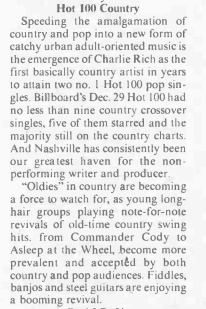 A half century ago, the music industry was panicking about the oil crisis (50 years later, its cause remains just as newsworthy), the Oak Ridge Boys were considering stepping outside of gospel music, Charlie Rich’s Behind Closed Doors topped the country chart for the eighth out of its 21 (!) non-consecutive weeks in that spot (it was the biggest country album of both 1973 and 1974 per Billboard), and fiddles, banjos and steel guitars were back! Asleep At The Wheel, trendsetters? The more things change…