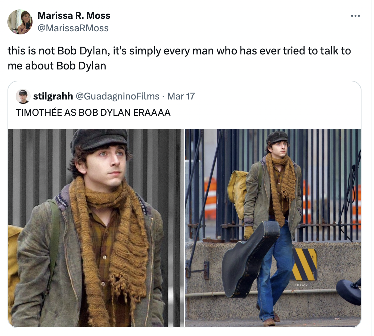 It's never a massive blast being a female fan of a band that the culture at large has decided that men have ownership over, and I don’t think that this is even particularly true about Dylan (and, for the most part, I stopped caring about that long ago). And I am sure plenty of women could write this same story about Springsteen or Petty or Neil Young. But I’ve loved Dylan for as long I can remember, and loathed the experience of loving him about the same. That’s what we’re talking about today. I made this joke on Twitter the other day about the new biopic, and it sums up a lot of this pretty well. Come on – you know this man too. He just wants to tell you what he knows. He’d like to talk at you about the one show you didn’t go to on the tour you missed. He’d like to know your cards.