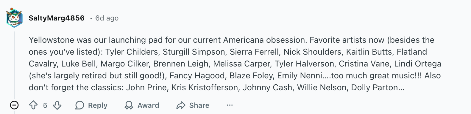 The closest artists to him soundwise, I think, are Kaitlin Butts and Maggie Antone — but I'd argue that Tyler Childers and Charley Crockett and Billy Strings and Sierra Ferrell belong in this sphere as well, having reached far beyond the typical "Americana" audience, riding (I'm guessing, at least) social media and big syncs to success that is not really lacking anything from not being on country radio.