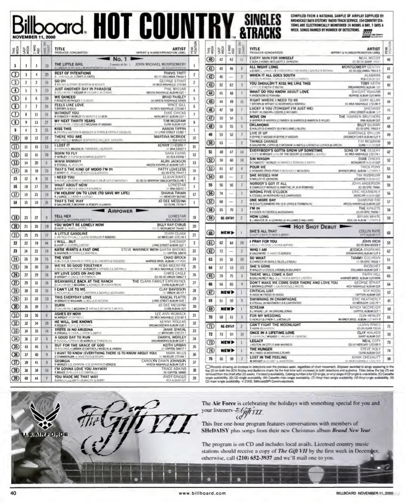 Some high highs — "Go On," "Without You," "Born To Fly" — and some low lows. John Michael Montgomery's "The Little Girl" might be the worst song I've ever heard — as we discussed in the last iteration of this series, the schlockfest at country radio was already well underway pre-9/11. "www.memory" in the upper echelon of the country chart is simply…too beautiful. I wouldn't say this moment was a country radio pinnacle, but also we need more "www.memory" energy in the world!