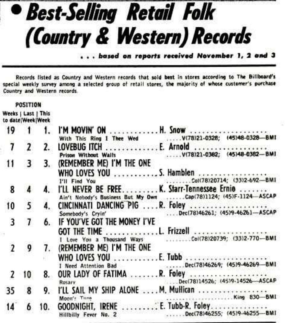 In its 19th (!) week on the chart, we have the now-standard "I'm Movin' On," a Hank Snow composition that was also the Canadian's breakout hit. It's a very traditionally performed tune, laden with guitar and fiddle and driven by a swinging country shuffle; the influence of the more famous Hank (Williams, obviously), though, is felt in the tune's blues structure and Snow's somewhat stilted attempts at using slang ("Daddy" rarely sounded so proper)...
