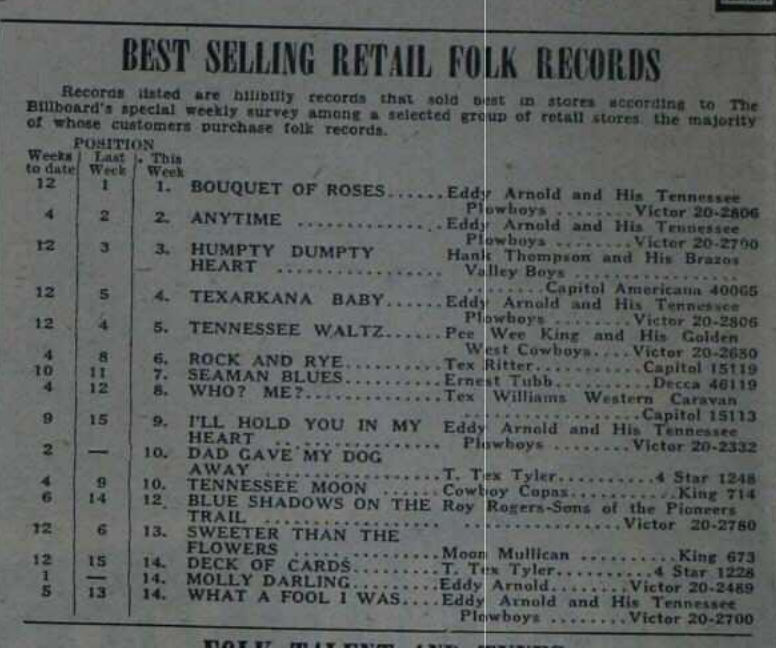 Aside from “Dad Gave My Dog Away” (???? a spoken word piece about a dog named Bruce…good name for a dog) and one million Eddy Arnold songs, one of the other through-lines of this chart is its Tennessee theme. The first charting iteration of the now-standard “Tennessee Waltz,” by Pee Wee King and his Golden West Cowboys (coincidentally, Eddy Arnold’s old band), was just past its chart peak; another version of the song by Cowboy Copas was still on the jukebox charts. Confusingly, Copas — who had also been in Pee Wee’s band — actually recorded the song first, and then immediately recorded and released another very similar song called “Tennessee Moon” (also charting here) before his “Waltz” even hit store shelves. Where did this sudden fascination with Tennessee-themed waltzes come from?? Well, Bill Monroe, who had considerable success with his “Kentucky Waltz” and “Blue Moon Of Kentucky.” King and his singer, Redd Stewart, spun up some lyrics to a wordless waltz melody they’d been playing for years, and thus one of country’s prettiest standards was born. I’m particularly partial to this heavenly Bonnie Raitt and Norah Jones version.
