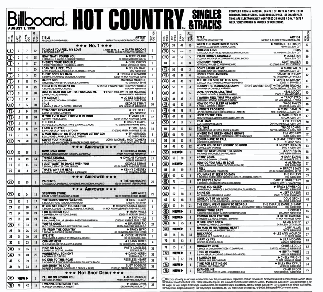 Goddamn have we regressed. Garth atop the charts with his goofy Bob Dylan cover. Seven out of the top 10 slots occupied by SEVEN DIFFERENT WOMEN. Two of my all-time-favorite George Strait songs in the top 20 (yes, I am aware one is a John Prine song! I also like Strait’s take). The Chicks on the cusp of their first No. 1 with a perfect song. “This Kiss,” “Where The Green Grass Grows” and “Bye Bye” ascendant. You could just listen through this and have a pretty nice time.