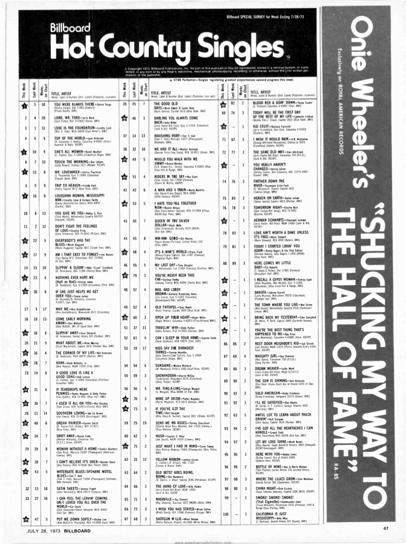 And finally to the chart itself (I apologize for the quality, gotta read between the lines here a little). There’s so much here to talk about — obviously the outlaws are ascendant, with Willie, Waylon and Kris all appearing on the chart (Kinky Friedman (!) is even there towards the bottom); a woman (whaaaa?!) on top of the chart — Donna Fargo, with her weeper “You Were Always There”; the rise of notable perfect song, the much funkier than it has any right to be “Louisiana Woman, Mississippi Man”; the presence of modest to hardcore horny country hits via Conway Twitty, Jeannie Seely, David Houston and Jeanne Pruett.